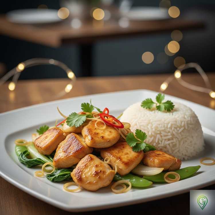 Mariniertes Hähnchen, Knoblauch, Chilischoten, Zitronengras, Zwiebel und Lauch aus dem Wok gebraten (Scharf) mit Hänchenfleisch und Reis.