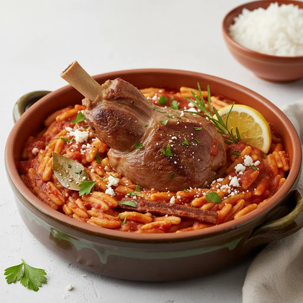 Tender, magere Lammhaxe im Keramiktopf, Reisnudeln served with tomato sauce