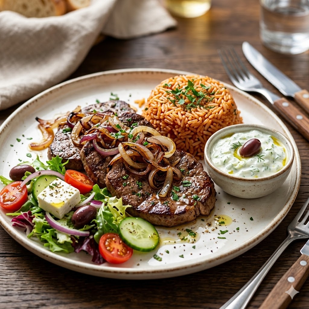 Tender grilled beef liver served with roasted onions, fine tomato rice, tzatziki, and a fresh salad.
