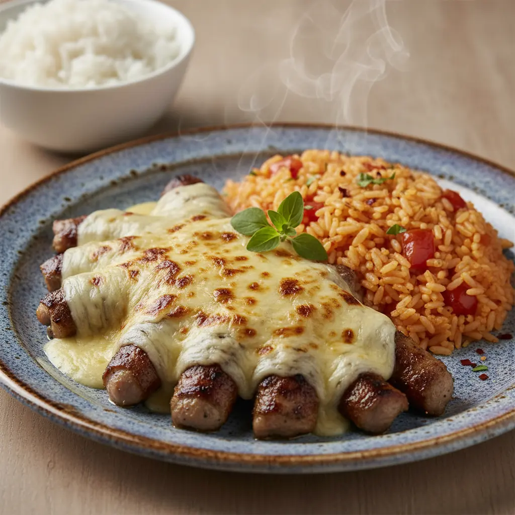 Gyros gratinated with melted cheese served with Metaxa sauce and melted cheese, served with tomato rice