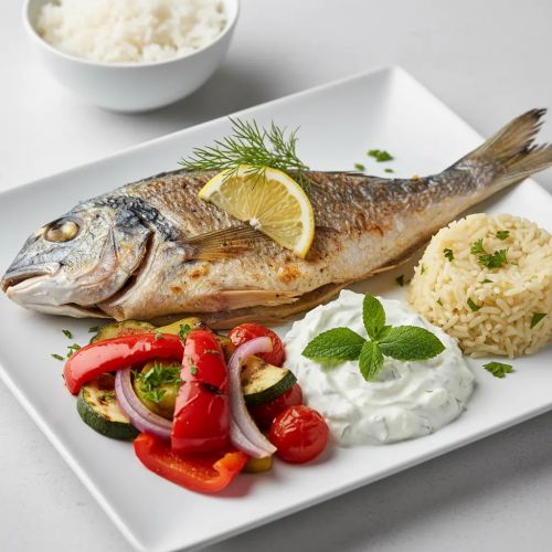 Gegrillt, mit Tzatziki, Grillgemüse und Butterreis