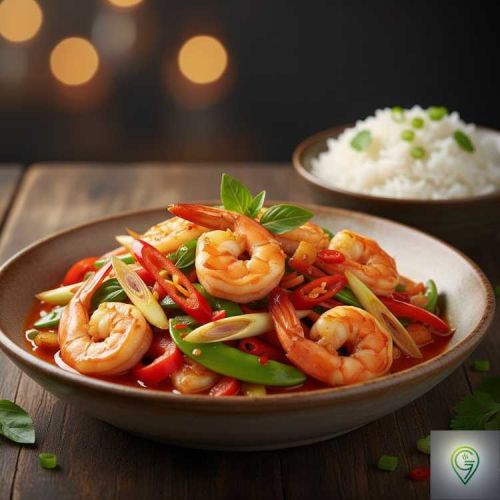Garnelen und buntes Gemüse im Wok geschwenkt, mit Zitronengras, Basilikum und Reis