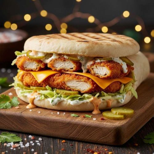 Hausgemachte Crispy chicken Filets Sandwich , Salat , Salzgurke, Cocktail Sauce, Knoblauch Sauce , Cheddar Käse