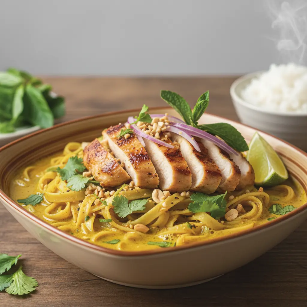 Reisbandnudeln in Curry-Soße mit Kräutern.