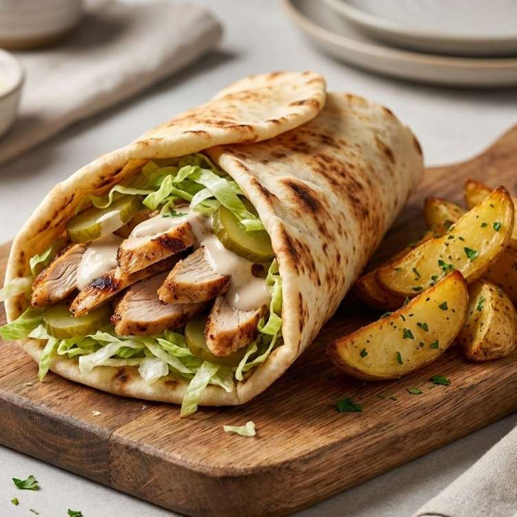 Hähnchenbrust Filet, Eisbergsalat, Salzgurke, gebackene Kartoffeln