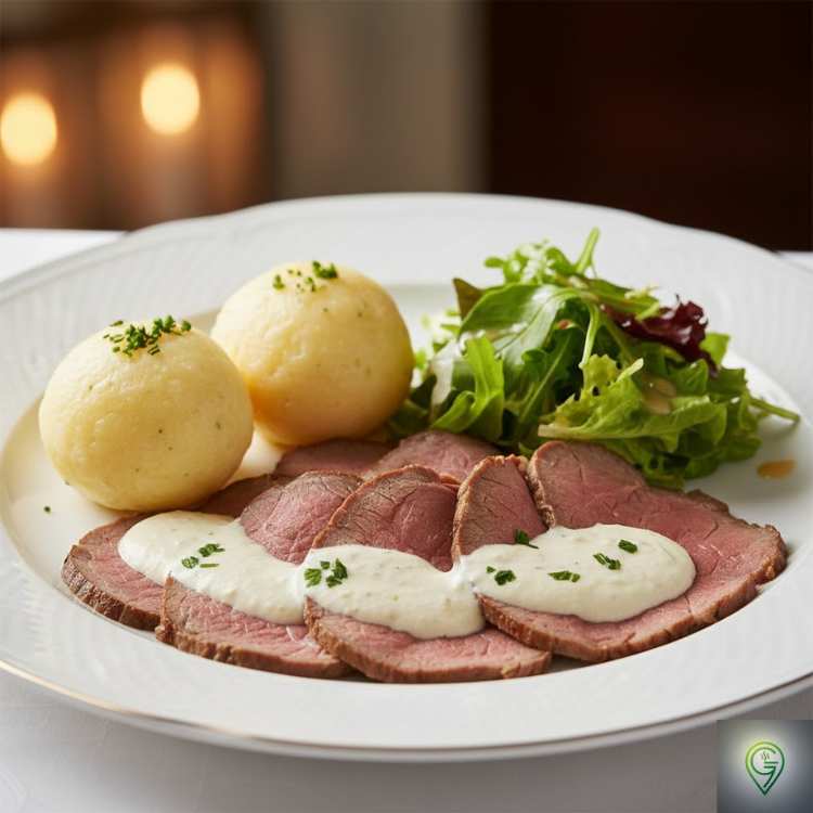 an Meerrettichsoße, mit Kartoffelklößen & Salat