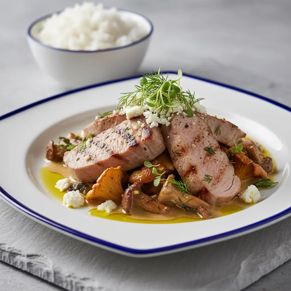 Juicy pork chop grilled with a savory mushroom sauce, paired with hearty sides.