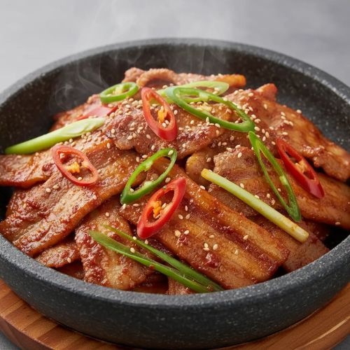 Scharf gebratene Schweinebauchstreifen in würziger Gochujang-Marinade - ein klassisches koreanisches Hauptgericht voller Umami. Scharf.
