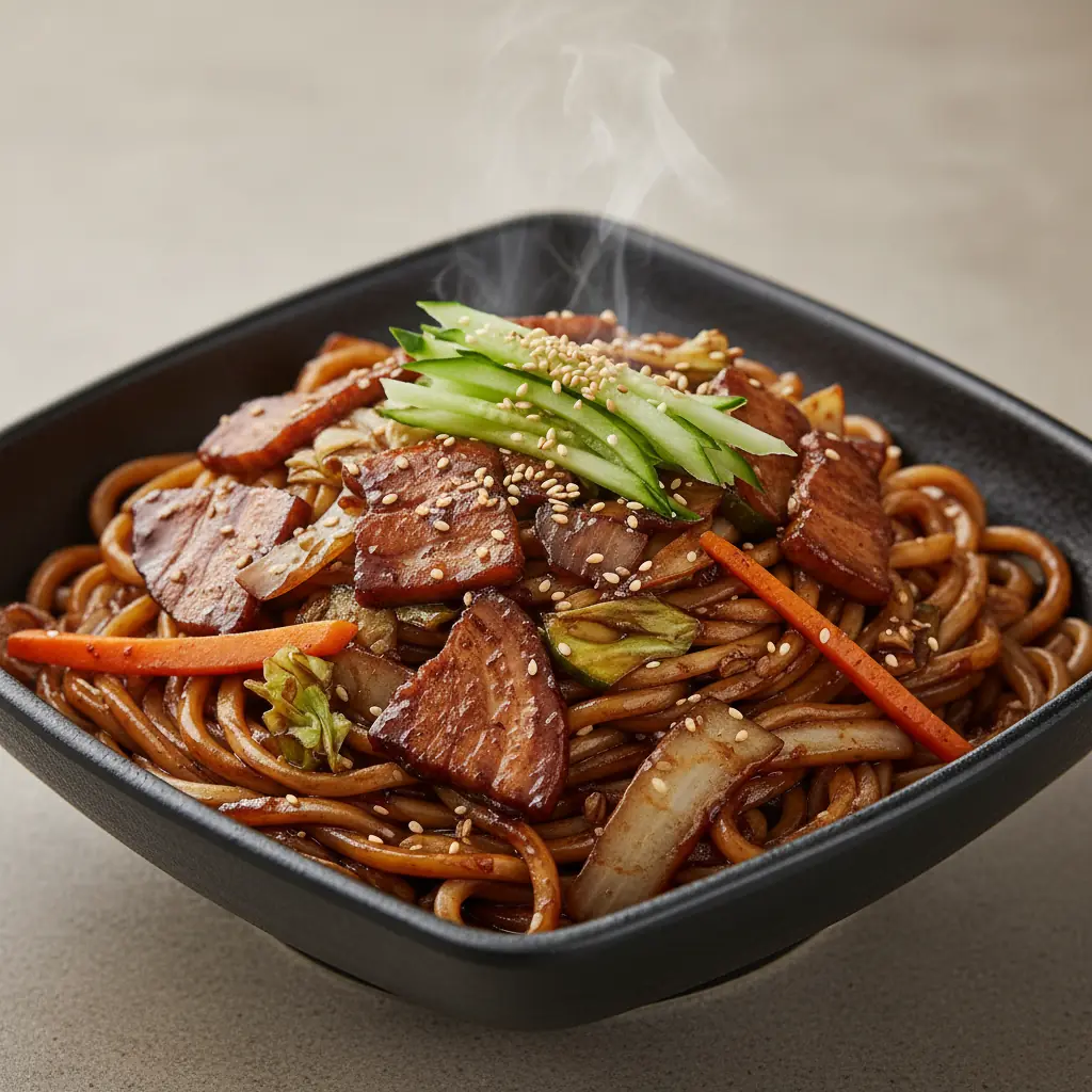 Koreanische Weizennudeln mit samtiger schwarzer Bohnenpaste, Zwiebeln, Kohl, Möhren und Zucchini - ein Comfort-Food-Klassiker. Optionen: Schweinefleisch | Huhn | Tofu | Korean. Schinken | Gemüse. Vegetarisch.