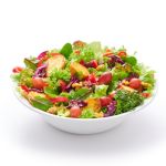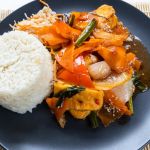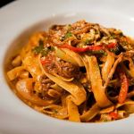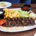 mit Schweinehackfleisch und Zwiebeln, dazu saure Sahne und Dressing