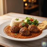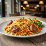 Grillspiess aus marinierter Hähnchenbrust, eingelegt in Olivenöl, Paprika, Zitrone u. Safran und Grillspiess aus Rinder- u. Lammhack, dazu Basmatireis od. Fladenbrot