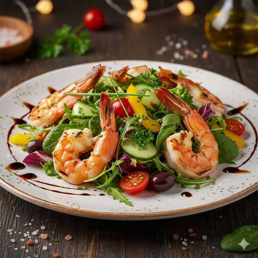 gegrillte Garnellen (6 Stück) auf ausgewähltem Saison Salatvariationen, Gemüse, Olivenöl & Balsamico