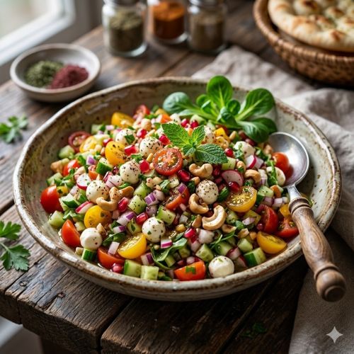 Mozzarella, Balsamico, Kirschtomaten, Senf, Feldsalat, Cashewkerne , Honig, Olivenöl