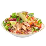 mit frisch gegrilltem Hähnchen-Filet, Granatapfelkernen, fruchtiger Mango, Karotte, Erdnüssen und Jasmin-Duftreis. Dazu empfehlen wir unser Honey Mustard Dressing